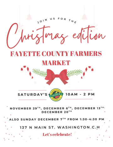 The Christmas Spirit ignites in downtown Washington Court House with a giant Christmas-themed parade organized by the Fayette County Chamber of Commerce! More details to come.